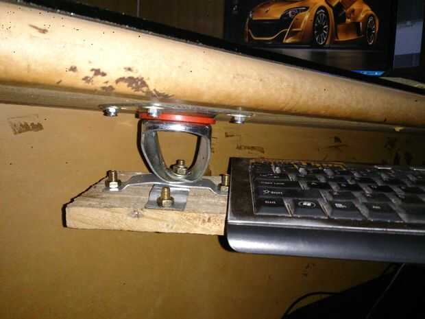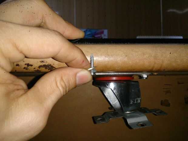 En primer lugar, atornille la rueda giratoria en la parte inferior del escritorio. Asegúrese de que la posición de la bandeja antes de atornillar, poner algunas marcas en donde usted debe atornillar.