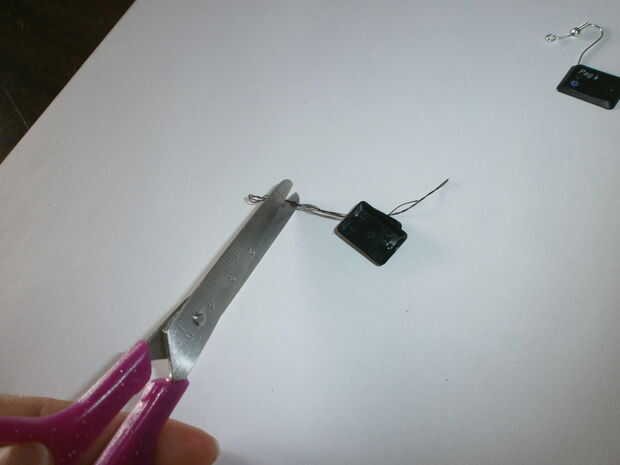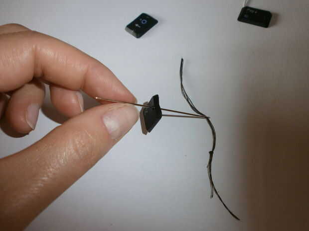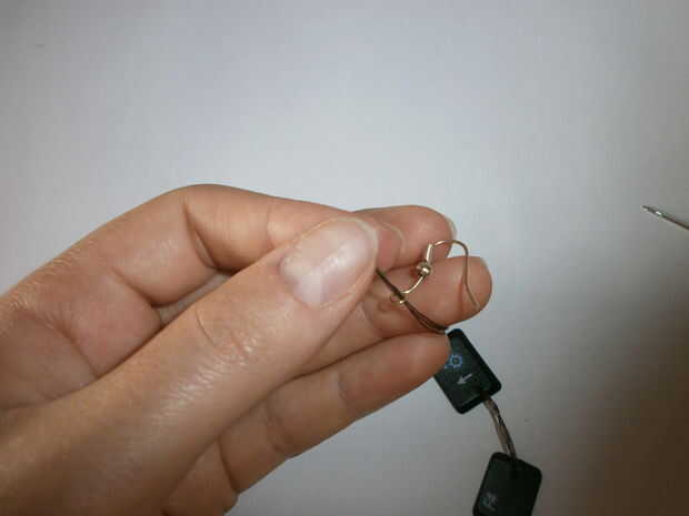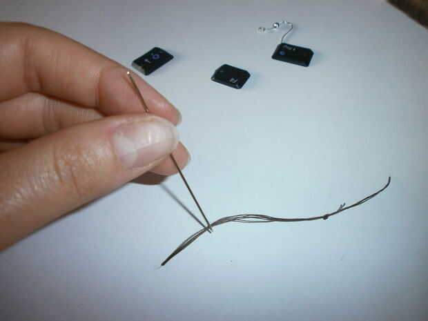 I begin to prepare. Tomar la aguja para enhebrar un pequeño agujero en el pequeño teclado. Preparar la longitud de alambre de unos 20 cm y junto con la aguja. La aguja y el hilo deben entrar en el agujero del teclado. Dos teclados los nodos 3 o 4 veces y sellen bien. Restos del hilo de rosca y corte. Al final tomar el gancho del pendiente para hilo y hago 3 o 4 veces los nudos apretados.