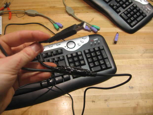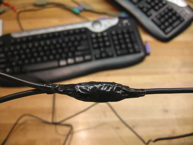Una vez que los cuatro grupos de cables rojo, blancos, negro y verdes son juntos bien envolverlos en cinta. Cuando haya terminado debe tener un cable del estilo Y de suciedad.