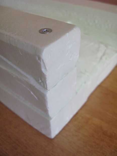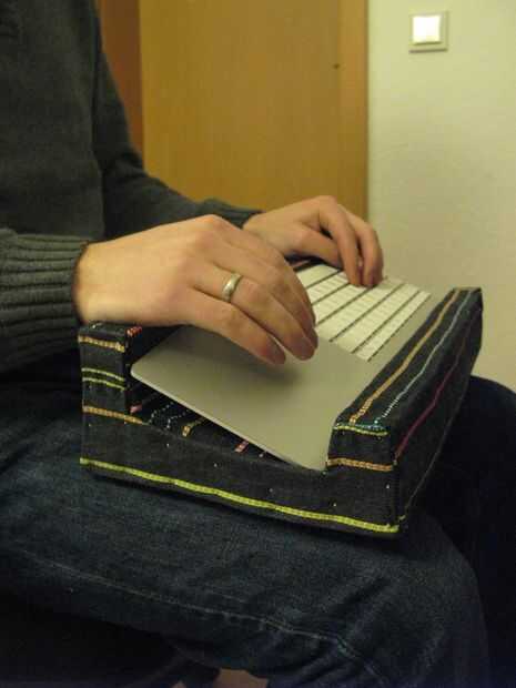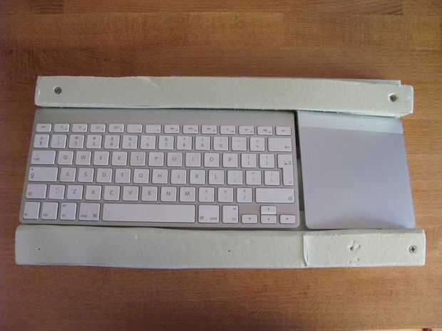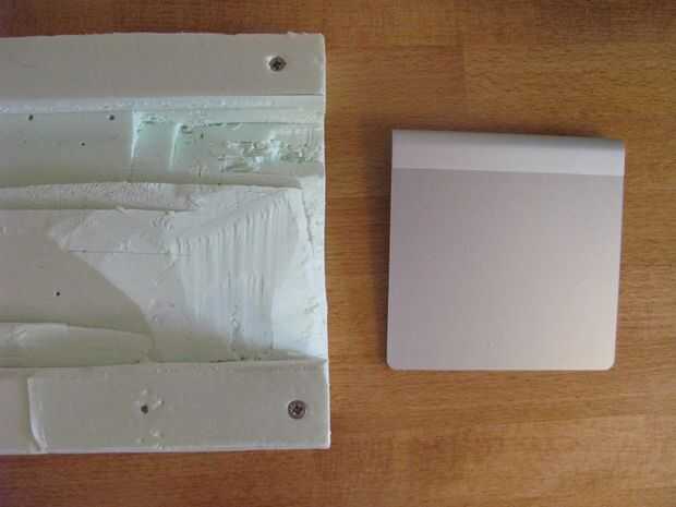 Para cortar, un cuchillo simple debe ser lo suficientemente fuerte. Las diferentes capas se ligará por largos clavos o tornillos para madera para mayor rigidez. Usted querrá obtener el teclado en un pequeño ángulo negativo mirando hacia fuera, por lo que las muñecas son en línea recta con los brazos anteriores. La facilidad de trabajar con poliestireno es ideal para ajustes incrementales - a tratar de un ángulo por un día, entonces corte un poco más si aún no estás cómodo. También he inclinado mi trackpad hacia los lados para dar cabida a una más natural, menos la posición de los brazos retorcidos.