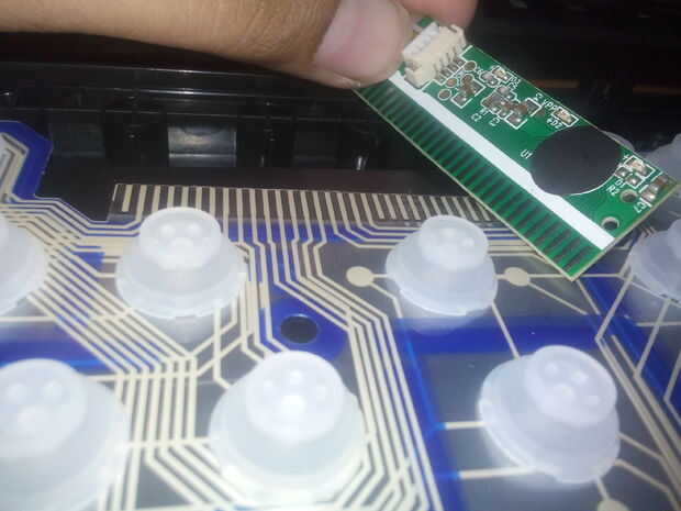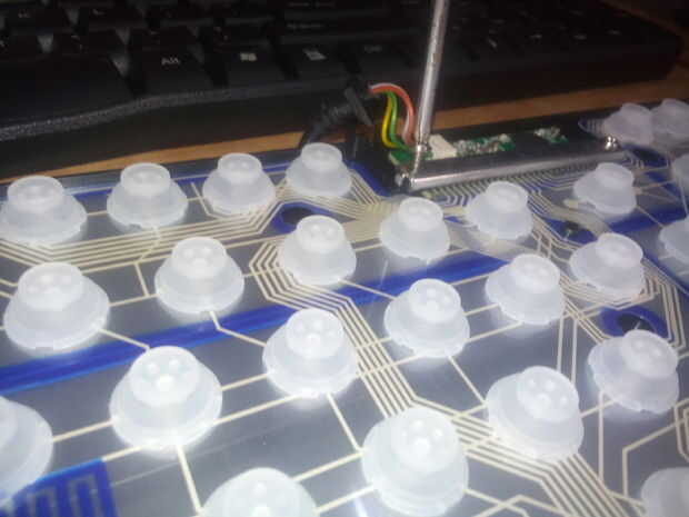 En mi teclado había una placa de circuito adjunta a la hoja y la base de plástico duro-a, así que tuve que quitar los tornillos que mantiene todo juntos con el fin de deshacerse del plástico de la base. Cuando se quitan los tornillos de la placa de circuito y la hoja se desprende.