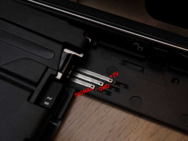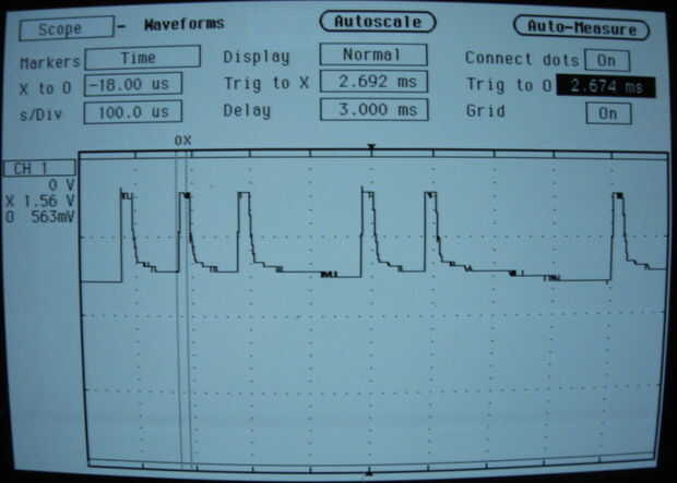 El teclado inalámbrico de PalmOne envía sus datos a través de un LED de infrarrojos en un tallo, con IrDA. Mientras que uno podría utilizar un detector IR para descifrar los datos, hay una manera más fácil. Si usted semidesnuda el teclado, tres cobre tiras están expuestos. El medio es tierra y el inferior es una línea de transmisión. Poniendo a un osciloscopio verifica que la señal en la línea de transmisión se codifica en 9600 8 N 1, con el alto nivel alrededor de 1.56V y con irDA formar del pulso: 1 alta y pulsos positivos 3/16 del tiempo de bit.