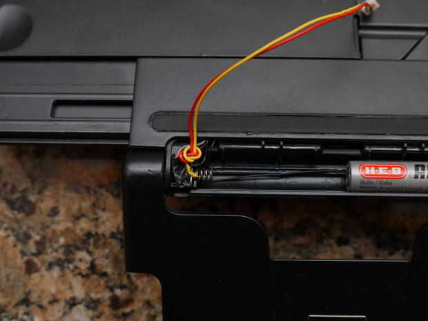 Hacer un agujero en el labio de la tapa de los cables de la correa de Brainlink a pasar, use cinta aislante para mantener las dos conexiones aisladas y un nudo pequeño alivio de tensión.