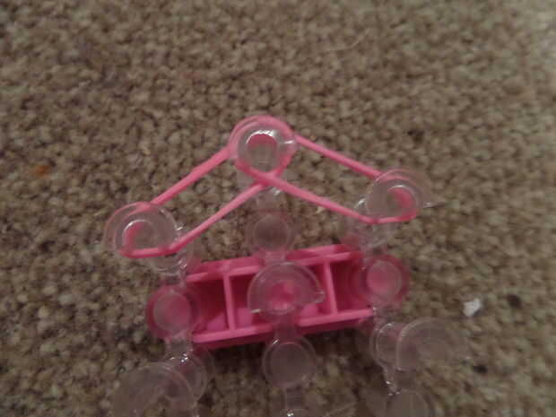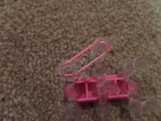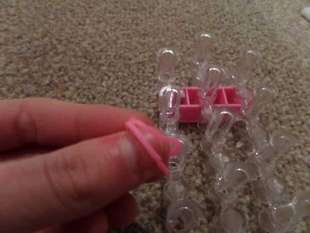 Empieza con doble bandas rosa luego ponerlos en la parte superior del telar en un lado luego del otro lado (aún dobles bandas).