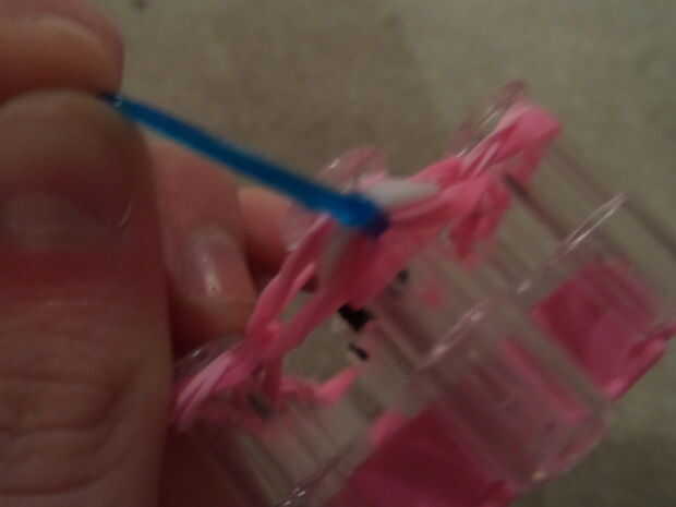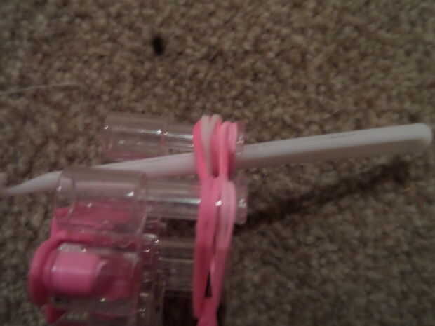 Así que lo que tienes que hacer es en el extremo opuesto de la banda de la tapa pegar el gancho a través de todas las bandas y poner una banda al azar en el extremo y tire a través de, por lo que la mitad está en la parte inferior y la mitad en la parte superior, luego tomar la banda inferior y tire de ella a través de la banda superior y tire. Ahora tienes un no y que es la parte hecho.