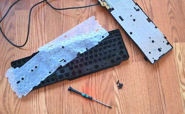 * Ahora también sería un buen tiempo limpiar tu teclado, si es necesario. Simplemente tome la pieza de arriba, con las teclas y correr bajo el grifo o limpiar con aire comprimido. Deje que se seque antes de continuar la Asamblea.