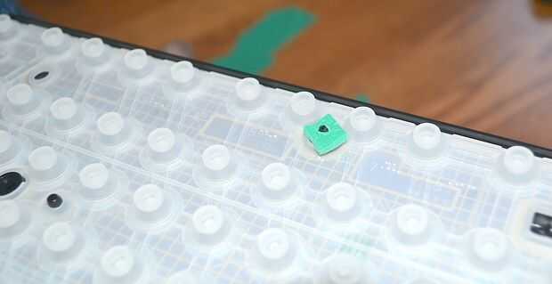 Vuelva a colocar la cubierta del silicón en la parte inferior media. Empuje cada tornillo en su ranura de la parte inferior, luego empuje en un pedazo de espuma. No te preocupes acerca de cómo perfecto, sólo asegúrese de que la espuma mantiene el tornillo caiga hacia atrás. Usted realmente no necesita de "foam" y subir todos los tornillos, pero asegúrese de obtener más de la mitad de los que están cerca del centro del teclado.
