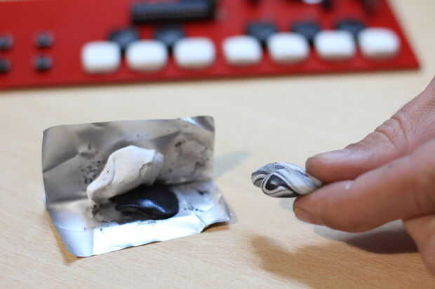 Para dar nuestro teclado un aspecto piano y una mejor sensación cuando se toca, vamos a hacer botones flexibles con Sugru. Vamos a usar tres paquetes de blanco y negro tres unos. Forma de 7 pequeñas bolas blancas de tamaño similar y los botones de la cubierta. Hice cuadrados, pero usted puede elegir cualquier forma que desee. No presionan mucho porque nos les llevará hacia fuera más adelante para el último paso. . Repita el mismo procedimiento con las cinco teclas negras. A continuación, puede utilizar una herramienta simple (como un cortador) para hacer los bordes más definidos. Sugru restantes de la mezcla en dos diferentes tonos de gris de los 4 botones a la izquierda (destinado a octava arriba y abajo y pitchbend). Que sugru cure durante 24 horas.
