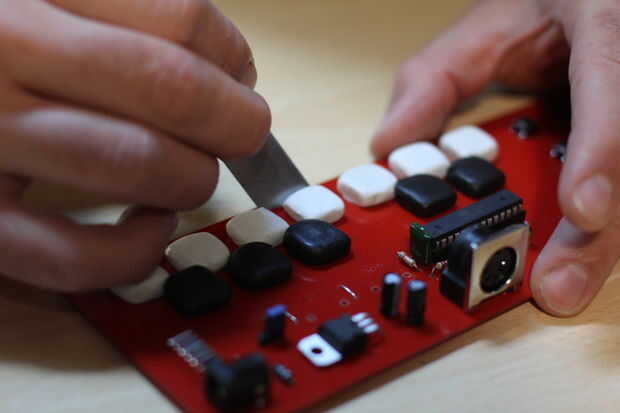 Una vez se cura Sugru, tomar botones a (uno a la vez). Verás el molde perfecto de la tecla. Con la ayuda de una herramienta puntiaguda, quitarle las esquinas para dejar en fondo llano. Esto dará el botón más flexibilidad y contacto con la superficie. Una vez que termines, puso nuevamente en su lugar y repita la operación con cada botón. Teclado MIDI está listo. Sólo tenemos un paso a la izquierda.