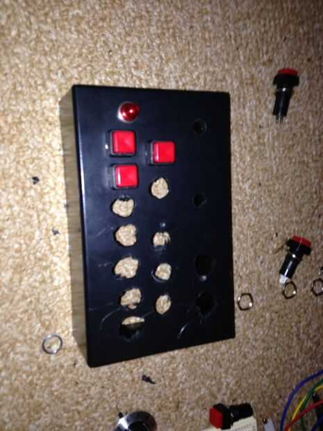 Para el recinto, utiliza una caja pedal de efectos plásticos pequeños y perforados agujeros en ella. El tamaño de botón es generalmente más grande de pedacitos de taladro en mi caso tuve que taladrar unos agujeros para conseguir que se ajuste.