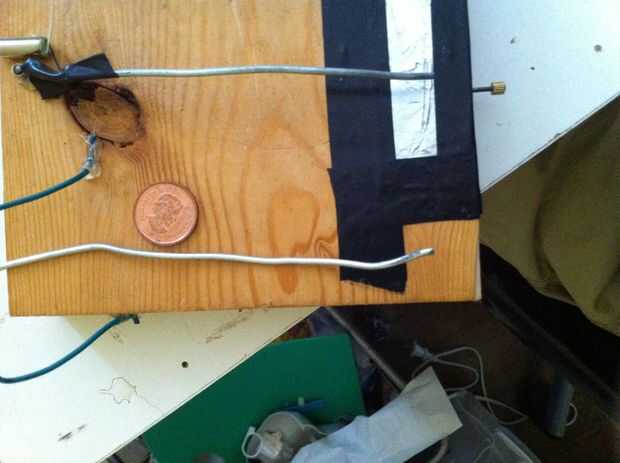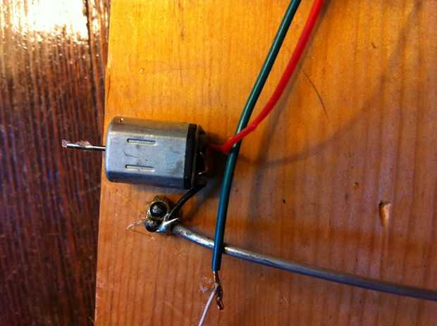 Tomar la duela de madera y la pongo horizontal, ahora medir 3 pulgadas en el lado izquierdo. Esto es donde va el motor de su primera y más pequeño. Marcar Dónde está tu motor y luego quitarlo. Cerca de 1/8 pulgadas a la izquierda del martillo de la marca en un clavo que es un poco más pequeño que el alambre de acero, luego quítela. Ahora introduzca una longitud de alambre de acero que es 1/2 una pulgada menor que el ancho de la duela de madera. Inserte este trozo de alambre en el agujero del clavo y fíjelo en su lugar con pegamento caliente. Llevar el motor más pequeño y conecte uno de sus cables al cable de acero con soldadura. Después de esta curva sobre el alambre de acero por lo que se cierne sobre el fondo de la tabla. Repita este paso con todos sus motores, en orden de menor a mayor, izquierda a derecha.