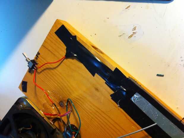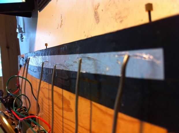 En primer lugar, haz una tira de 1,5 pulgadas de aluminio que es aproximadamente 2 pulgadas más largas que la sección de la tabla con los motores en él. La tira debe quedar debajo de cada extremo de los cables de acero. Ahora tome un pedazo de alambre lo suficientemente largo para alcanzar el interruptor y tira de ambos lados de la misma. La parte expuesta del cable en el lado derecho de la tira de aluminio de la cinta. Ahora para reforzar el aluminio, cubrir los bordes con cinta aislante. A continuación, conecte el otro extremo expuesto del cable al otro extremo del interruptor. Etiqueta interruptor con encendido y apagado de los lados correspondientes. Teclado del motor se acaba! Para operar simplemente pulse los cables de acero contra el papel de aluminio, y si lo hiciste bien oirá un tono sale el altavoz.