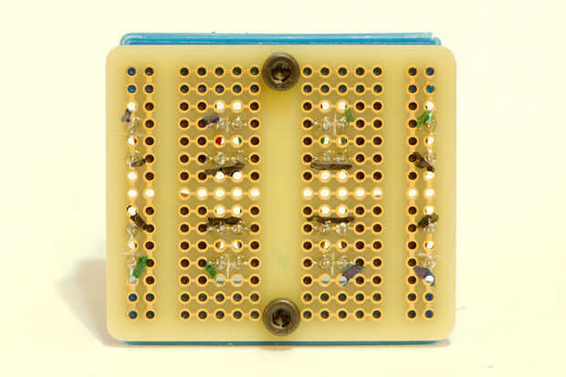 Estos redondos botones táctiles que ordené de Adafruit son agradables, pero tienen un tamaño bastante grande. La Junta de Adafruit Perma-Proto tiene un bonito diseño compacto, pero está diseñado para apilables cosas solamente en una dirección. Quería apilar estos botones ambos sentidos, así que tuve que ser un poco creativo y corte unos rastros a lo largo de la parte posterior de la Junta.