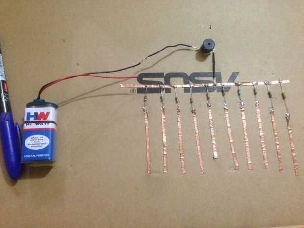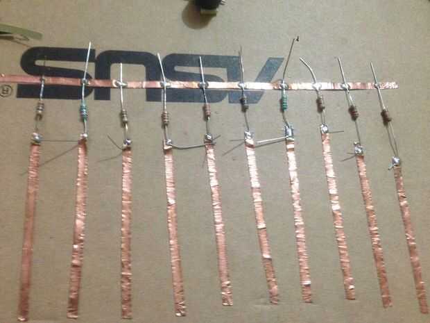 Organizar las resistencias con una pierna tocando en la parte superior de las tiras de cobre. Estas patas en las tiras de cobre de la soldadura. Coloque otra tira más larga de cobre en el extremo superior, debajo de las patas superiores de las resistencias y las patas superiores en esta franja de soldadura. Doblar y cortar el metal adicional que va más allá de los puntos de soldado.
