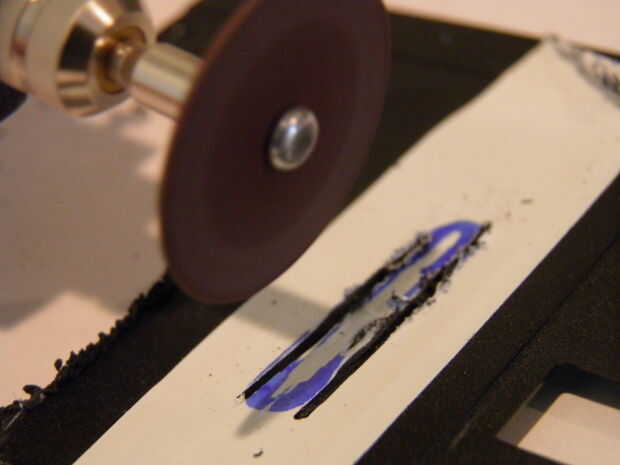 A continuación lo que necesites cortar el teclado. Me recomendaron poner alguna cinta en donde vas a cortar el agujero, así que si usted accidentalmente golpear la dremel, no conseguir rasguñado todo el plástico. Recomendamos seguimiento a lo que parece el cable para que puedas obtener una conjetura sobre cuánto recortar. Perforación de agujeros en los confines de la forma ovalada del cable ayudará a hacer el corte más fácil, así como lo que es mejor. Salir de la dremel y cortar!