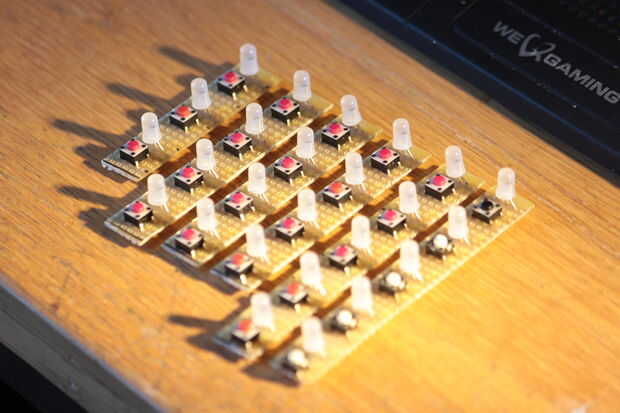 Primero coloca todos los botones y LED en lugar y soldado en (piernas van en los orificios de solver en el diagrama). Después de usé una herramienta de última hora de la pista para eliminar las pistas para evitar cortocircuitos/mal conexiones etc. (las cajas naranja oscuras en el diagrama).