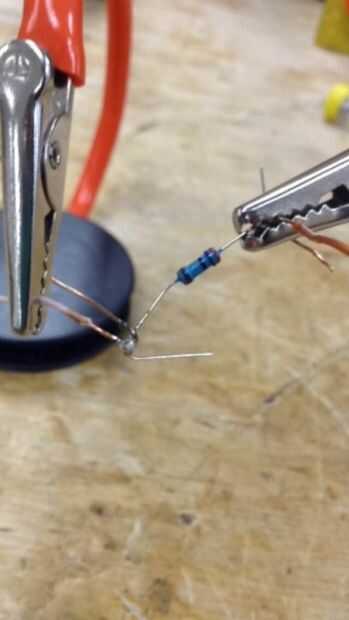 Cada sensible al tacto "clave" en el piano va a requerir una resistencia y dos alambres/cables. Un hilo a cada pata de la resistencia de la soldadura, pero asegúrese de dejar parte de la pierna que sobresale. La pierna se utilizará para conectar a la lámina en el siguiente paso. Hacer tantas de estas como piensa en tener teclas de piano