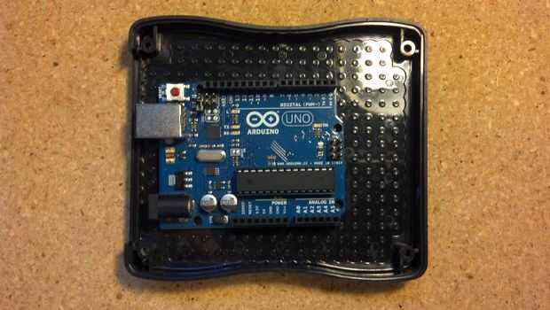 Cuando se coloque el Arduino en el caso, sería ideal utilizar algunos separadores de plástico o nylon. Desafortunadamente, los separadores que tenía disponibles (3/8" de altura) eran demasiado altos y no iba a cerrar el caso. Esto me causo que pegamento a mi Arduino con el caso. Es un poco plana que no tiene los puntos de enfrentamiento que es donde colocó un pegote grande de pegamento caliente para pegar mi Arduino. Opté por colocar el Arduino para que la placa todavía cabrían en el puerto USB empujó contra él. También podría ser la memoria de puerto USB a un poco para quedar al ras con la placa posterior después de la terminación.