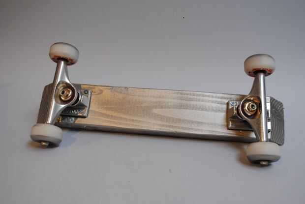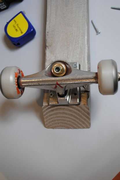 a continuación Atornille los camiones en la madera, he usado las canalizaciones verticales que es tradicional en un monopatín, pero probablemente innecesario para este proyecto. Asegúrese de que los camiones están alineados o daremos vuelta permanentemente :-)