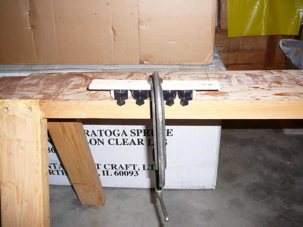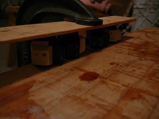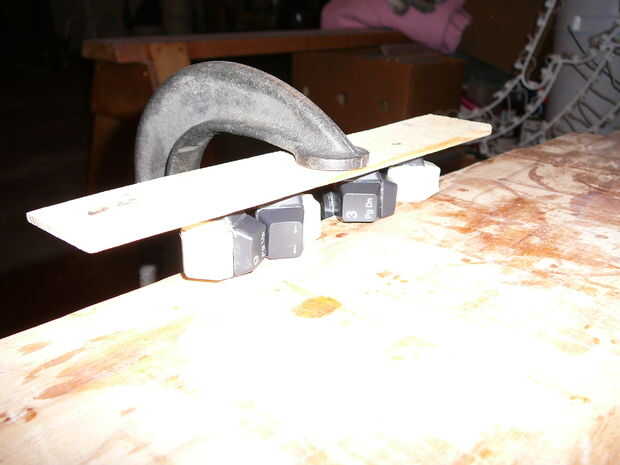 Después que tenía las teclas en los cubitos, ponerlos en una abrazadera que se seque. He puesto una pieza delgada de madera entre los cubitos y la pinza así pude poner 4 en una abrazadera y así no dañar las piezas. Utilicé un caballete de aserrar madera, pero estoy seguro de que el Banco de trabajo que tienes funcionaría muy bien. Sujeción no es crítica, ya no sale el pedazo de centro y sería una molestia para intentar fijarlo con la abrazadera, pero sentí que necesitaba para añadir presión a las piezas para que no resbalón.