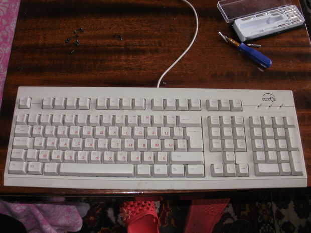 estoy seguro que muchos de ustedes abrieron un teclado por lo menos una vez. En este caso incluso de apertura no era necesario. Todo lo que necesitaba era un destornillador y a 5 minutos de mi valioso tiempo. Los botones son fácilmente deattached con un pequeño empujón con el destornillador.