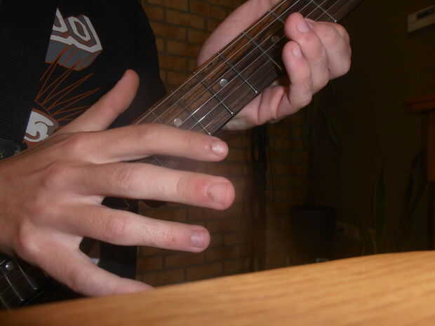 3: la película de su dedo, no importa si usted película apagado hacia arriba o hacia abajo. De esta cadena, es más fácil que hacerlo hacia abajo, como que no puede accidentalmente golpeó otra cadena con el dedo. Como que la película fuera, la nota del traste quinto jugará. Esto se llama un pull-off (como que tocas una nota más baja que la anterior)