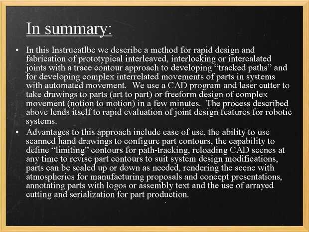 Las ventajas de este enfoque incluyen facilidad de uso, la habilidad de usar dibujos de mano escaneados para configurar los contornos de la parte, la capacidad de definir limitar contornos para seguimiento de ruta, recarga escenas de CAD en cualquier momento para revisar parte de contornos para adaptarse a modificaciones del diseño del sistema, las piezas se pueden escalar hacia arriba o hacia abajo según sea necesario, haciendo la escena con atmósferas para fabricación propuestas y presentaciones de concepto , describiendo las piezas con los logotipos o texto de la Asamblea y el uso de corte vestida y serialización para la producción de la parte.