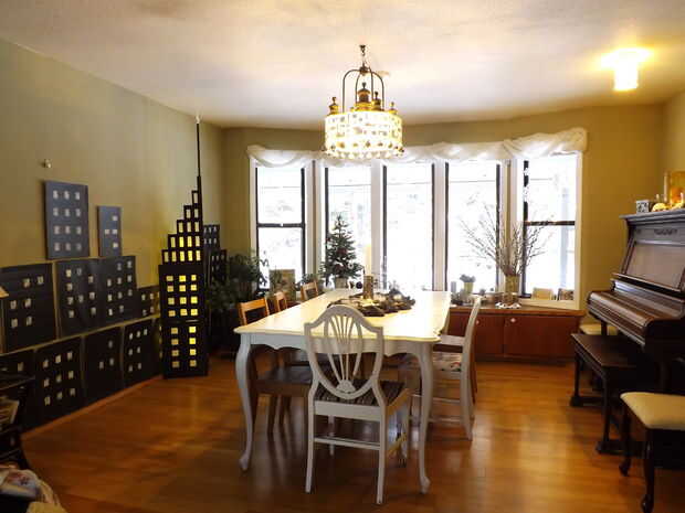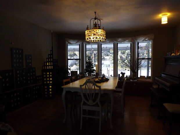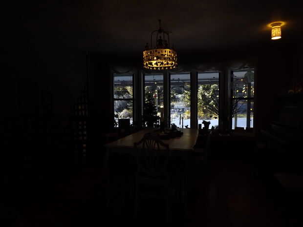 Recientemente, quería fotografiar el comedor con una lámpara casera encendido y una escena brillante, cubierto de nieve a través de un sistema de windows. Quería que detalle en la habitación, en la lámpara y en la escena de nieve al aire libre.