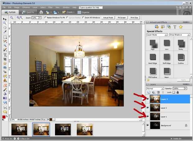 3. Repita con el segundo más ligero y el más ligero fotos, pegar encima de las fotos más oscuras. Todas las fotos de ahora aparecerá en la barra lateral de capas apilada de más oscuro a más claro.