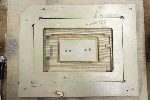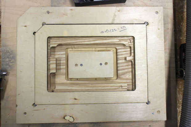 La última plantilla es la plantilla de la superficie trasera, haciendo una cavidad que se adapta a la pieza posterior con los orificios. Esta profundidad es de 1/8".
