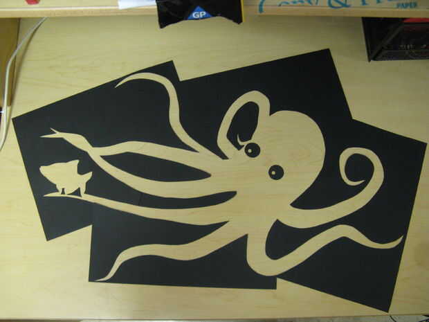 Quería jugar con las relaciones de figura-fondo, así que salí la forma exterior como varias hojas llenas de papel de construcción derramado descuidadamente en la pared. El pulpo sí mismo se define por la ausencia de papel, donde la muestra a través de la textura de la pared. El pescado fue cortado y trasladado fuera de la obra para intentar dar algún movimiento, romper el límite y mantener la pieza de la sensación restringida. Además, un corte; dos peces!