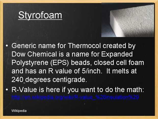 Valor de R representa la característica del aislamiento de los materiales. El valor de R es de 5. El grueso de la espuma de poliestireno en este proyecto es 1cm (0,39 pulgadas). Así, el valor de Q que es la conductividad del calor (térmico) es 0.078. 0.078 siendo tan pequeño número medio que no es mucha pérdida de calor que hace espuma de poliestireno un buen aislante. Proporciona un medio a través del cual hay menos transferencia de calor.