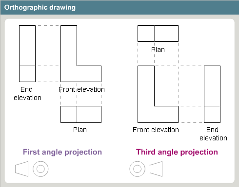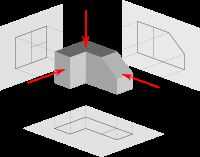 Primera proyección de ángulo es el estándar ISO y se utiliza principalmente en Europa. El objeto 3D se proyecta en el espacio "papel" 2D como si estás buscando en una radiografía del objeto: la vista superior es la vista frontal, la visión derecha está a la izquierda de la vista frontal.