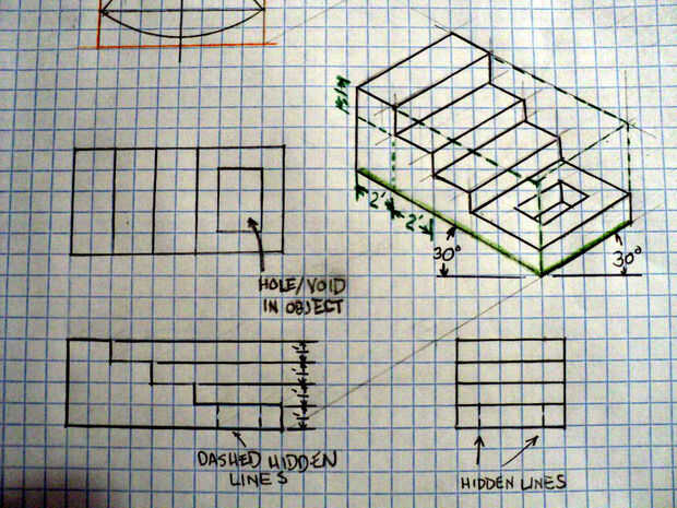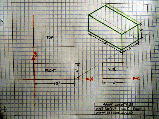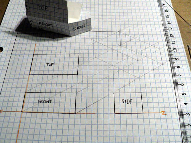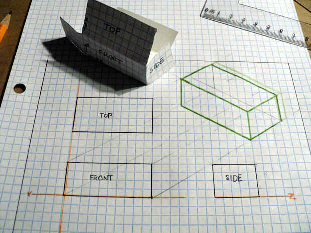Si extendemos a todos los puntos de intersección para determinar nuestra forma dimensional 3, terminamos con un dibujo que es matemáticamente correcto mapa en el espacio pero reduce las líneas que van en la distancia. Ya que queremos ser capaces de medir directamente de una ingeniería de dibujo, si utilizamos las medidas reales de la cara de la x, y, eje z, y la vista era tal que las líneas se van la horizontal 30 grados, se puede dibujar un objeto tridimensional 3 razonablemente exacta. Otros ángulos pueden utilizarse pero parece de 30 grados para proporcionar resultados que son menos distorsionados.
