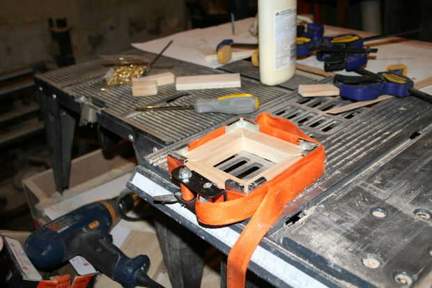 3. Coloque la abrazadera de la correa o cuerda alrededor de la pieza. Es mejor tener esto en su lugar antes de que usted tiene que apretar. Usar pequeños trozos de madera con pegamento en los no es un hobby que me gusta disfrutar de.