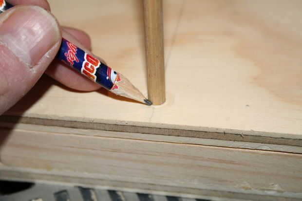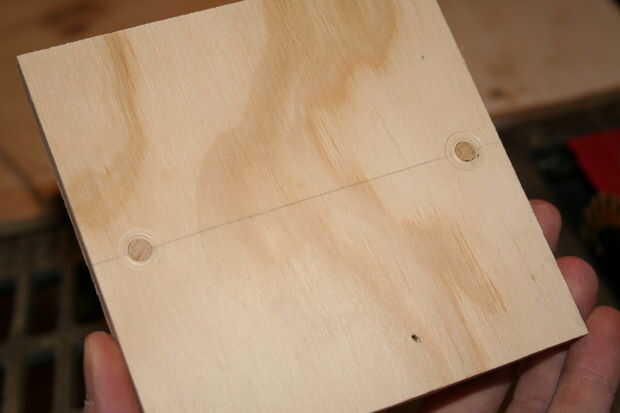 11. miden aproximadamente a la mitad a lo largo de un lado (debe ser de 2 1/2 pulgadas) y una media pulgada en. Haga dos agujeros en la pieza de arriba, lo más recto posible.