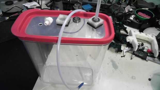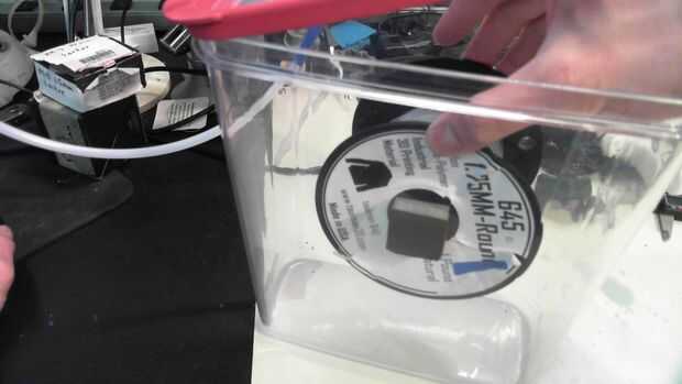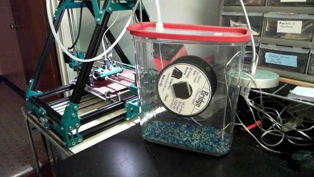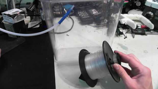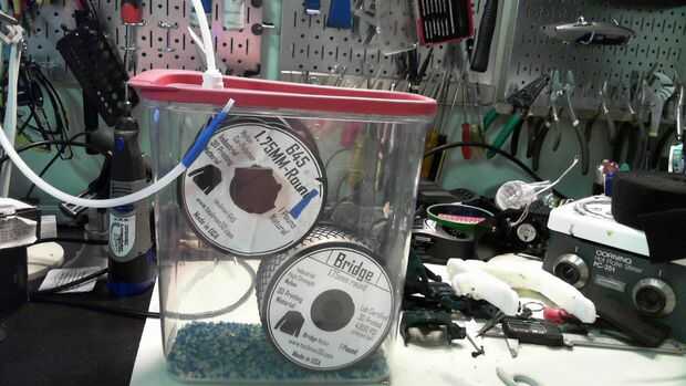 El diseño es extremadamente simple y aunque yo en la lista componentes específicos, sin duda pueden reemplazarse con cualquier cosa que funcionará de manera similar. Las dos consideraciones más importantes son que la caja puede ser sellada, más o menos hermética, y que el filamento se puede cola fuera de la caja con la menor fricción posible. Este segundo punto es absolutamente clave.