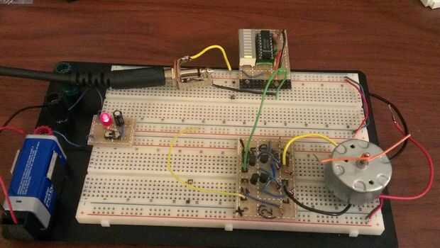 Además, una de las entradas del puente H está conectada a la misma fila que el VU metro entrada para leer la señal de audio entrante. La otra entrada el puente en H está conectado a tierra. Las salidas del puente H se conectan a los terminales del módulo de motor de DC. En este arreglo, el motor funcionará a una velocidad proporcional al nivel de la señal de audio entrante. Como se puede ver en el vídeo, el motor girará cuando se proporciona una gran señal de audio.