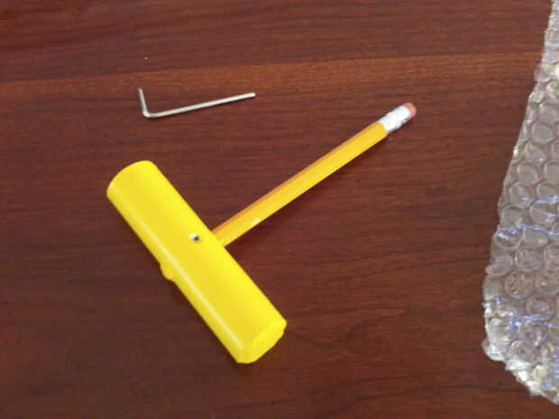 En caso de estar interesado el Tee utilizado es un dispositivo común para ayudar a alguien que tiene un puño cerrado o una restricción similar. Hice esta uno tomando una sección de 4" de 1" PVC y relleno con chatarra PLA; sólo calor y empuje en el PVC. Asegúrese de llenar el sólido de la sección media, así que puede fijar los tornillos de gusano. Pongo dos agujeros uno en cada lado y dos tornillos de gusano, que calienta los tornillos de gusano con una pistola de calor y se atornilla luego en. Hizo un ajuste apretado. Probablemente sólo puede usar un tornillo o ninguno si no va a cambiar el lápiz hacia fuera. Un tornillo de cabeza plana regular también probablemente trabajaría; solo contador de sincronización para piso.