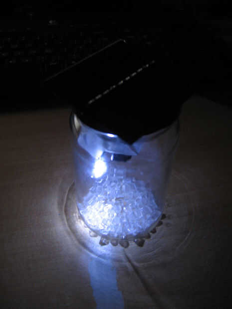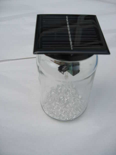 Este es un juego bonito, energía sostenible, con toda la potencia de la lámpara siendo fuente de energía renovable solar. Utiliza frascos de mermelada rescatados como recinto pero también podría utilizar algunas partes construidas como toroides de CFLs viejo