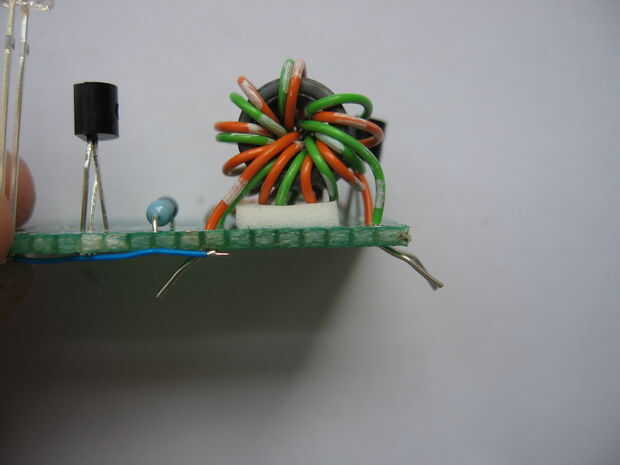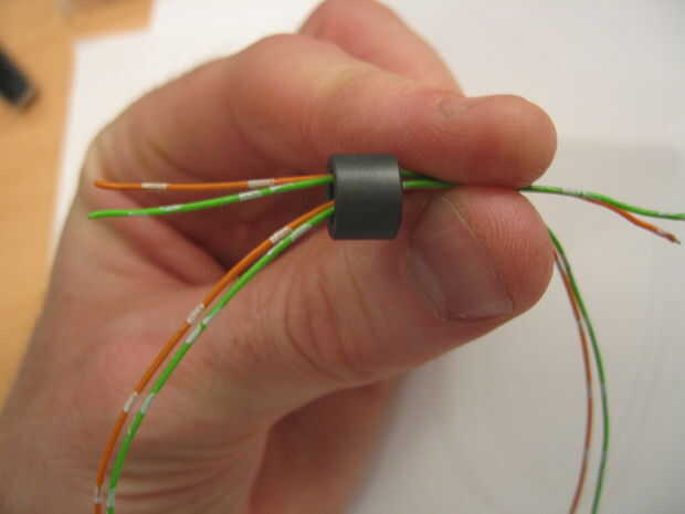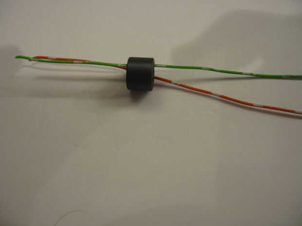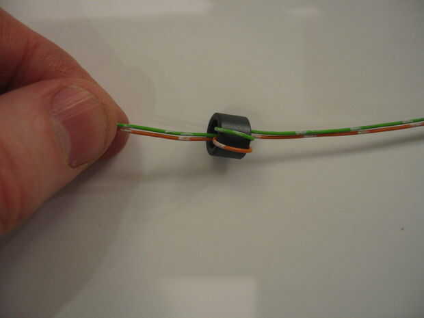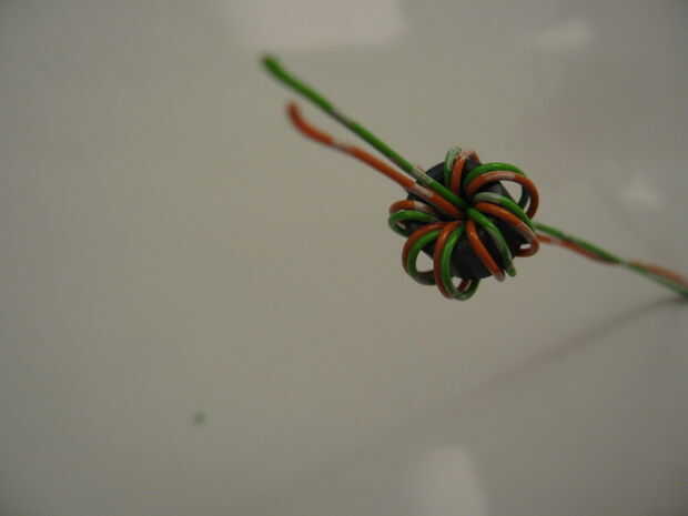 Estoy usando granos de ferrita alrededor de 9,8 mm de ancho por 7,5 mm de profundidad con un agujero de 6,5 mm de diámetro. Sea cual sea el tamaño que utilice, usted querrá suficiente cable para 6-8 vueltas. Para los granos del tamaño de la mina, tomar unos 20-30 cm de un par de aislamiento cables de cobre sólido calibre 22 que (yo uso alambre de un cable de 3 pares de teléfono viejo). Colores contrastantes hacen la vida más fácil. Empuje los cables a través de su toro dejando alrededor de una pulgada (2,5 cm) que se pega hacia fuera en un extremo. Ahora lazo largo termina ronda hasta que ha hecho lazos de 6-8 distribuida uniformemente alrededor de su grano. Mis cuentas son más o menos completo después de 8 vueltas de este hilo.