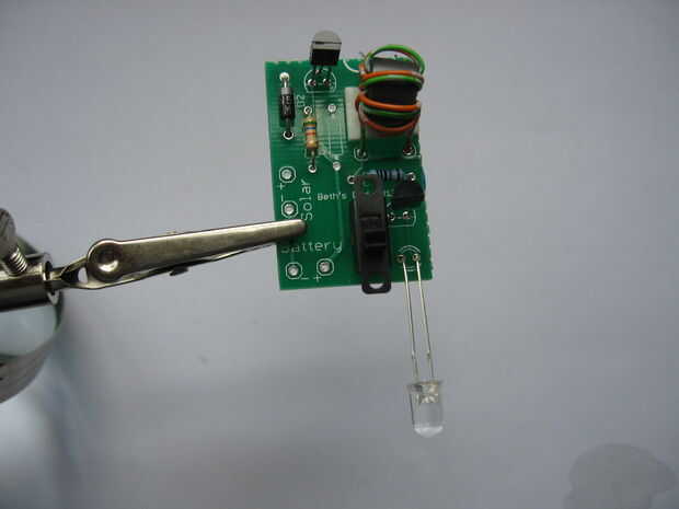Ahora tome un cable de un color de un extremo del Toro y el otro color del otro extremo y ponerlas en los agujeros 1 y 2. Los otros extremos van en los hoyos 3 y 4 para que el agujero en el toro ahora apunta en todos los ámbitos. Deben caer naturalmente para que los cables del conectan de los agujeros 1 a 4 y 2 a 3, pero comprueben o no funcionará! Doblar los cables hacia fuera un poco para mantenerlos, voltee la placa y lo de la soldadura.
