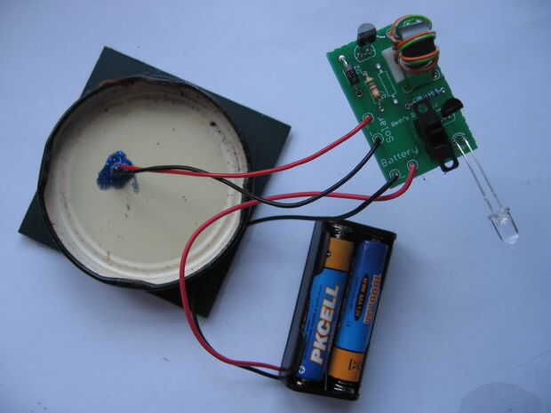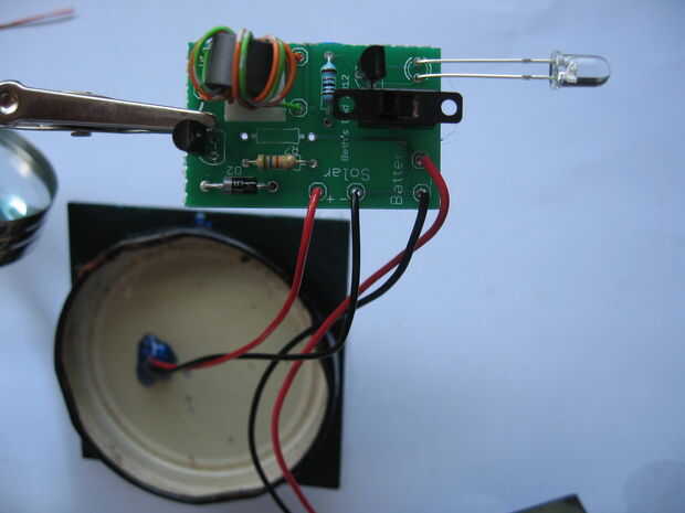Ahora tienes el circuito completo. Si Inserte las baterías cargadas y cubierta de la célula solar debería ver la luz por LED.