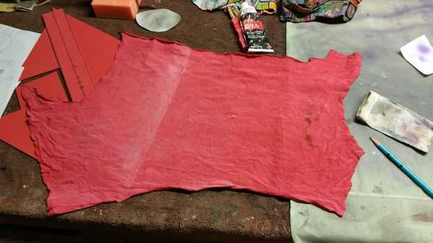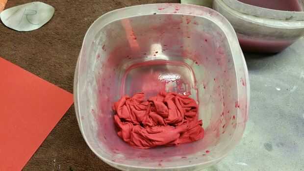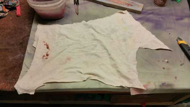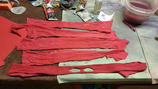 Fueron de las últimas piezas de este traje para hacerse la mascarilla y envoltura de brazo/pierna. Elegir que la envuelve con la máscara. Para ello, tengo una camiseta vieja y había empapado en pintura acrílica rojo descafeinada. Esto era una forma barata de hacerlo y funcionó muy bien. Estas piezas nunca se lavan, por lo que no importa que usé pintura en vez de tinte de la tela para colorearlos. Yo a remojar la camisa en la solución de la pintura durante varias horas, luego sacado hacia fuera y lo colgó a secar. Una vez que estaba seco, la corté en tiras de anchura relativamente igual. Corté los agujeros del ojo en una de las tiras para hacer la máscara.