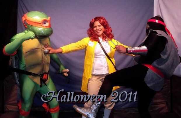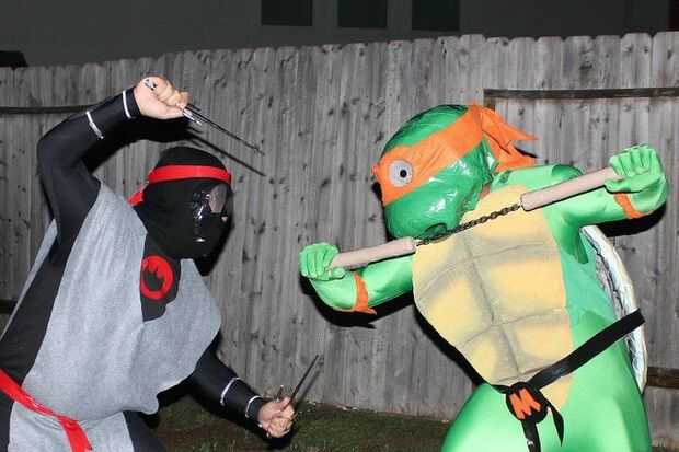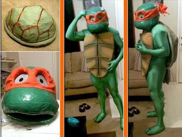 PIC 3: Detalles: Michelangelo (Teenage Mutant Ninja Turtles) la cabeza se hace con alambre, cinta verde pato y fieltro naranja. Shell hace con marco de alambre, cinta pato y se pinta el papel maché. Esto es donde todo comenzó 4 semanas antes de halloween, tuvo la idea de hacer todas las cuatro tortugas, pero hacerlo derecho tomó un montón de tiempo, así que hicimos lo mejor con el tiempo.