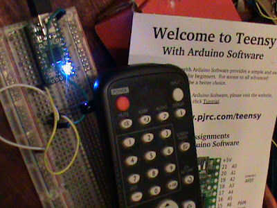 esta semana utilicé un Teensyduino actuar como traductor entre un control remoto infrarrojo y mi ordenador. El Teensy Lee las señales infrarrojas del control remoto y luego emula un teclado USB. Lo estoy usando para el control de VLC Media Player c