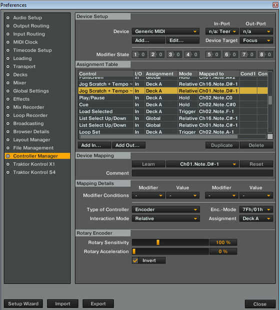 Observe que el mensaje de encoder MIDI tiene tres modos (nota, Ableton Live y otros). Debes elegir uno que mejor se adapte a su software y descomentarlo. Esto puede implicar algún ensayo y error. He probado modo de 'Notas' en Traktor con éxito. Tomash G (entusiasta compañero controlador) utiliza el 'Otro' modo de Traktor y por supuesto, utiliza el modo de 'Ableton' con Ableton.