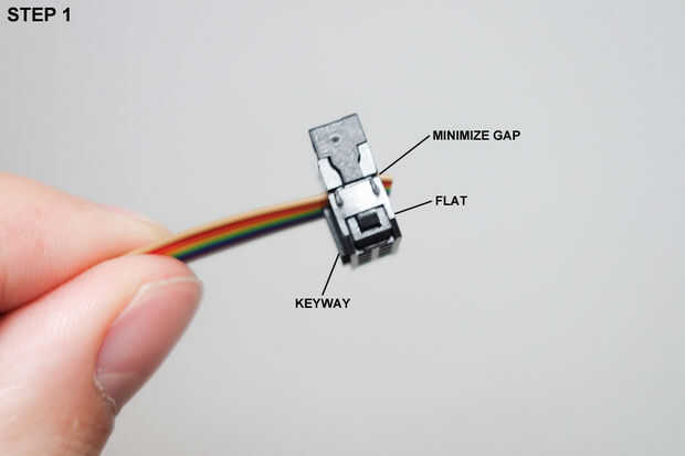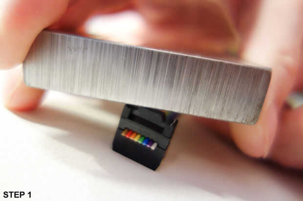 Conecte un conector hembra de la cinta hasta el final de los seis cables de 8 hilos cinta (más fácil decirlo que hacerlo). A menos que tengas super fuerza, esto requerirá un bloque rígido. La cuña del conector hembra cinta entre el bloque y una superficie dura. Empuje hacia abajo hasta que oiga un 'clic'. Inspeccione el conector. Un lado probablemente ha bloqueado en su lugar. Empuje en el otro lado hasta que escuche otra 'clic' y ambos lados se bloqueará en su lugar.