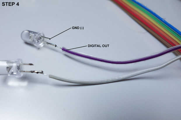 Utilice un alicate, tira de ambos extremos de uno de los cables de seis cinta. La soldadura de los extremos a los dos LED (ver imagen). Asegúrese de que su soldadura en el conector de LED más (pierna).
