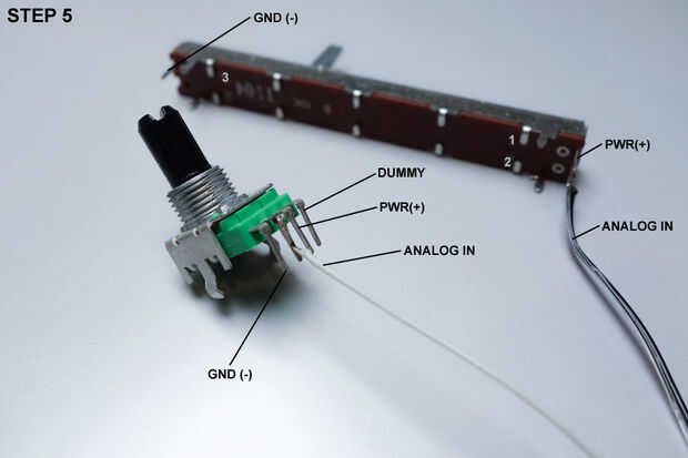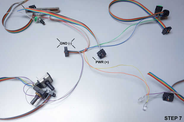 Debe tener dos cables de cinta restante. Uno se utiliza para la tierra, el otro por el poder. Tierra se requiere en todos los componentes. Energía es necesaria sólo en los potenciómetros. (ver imágenes)